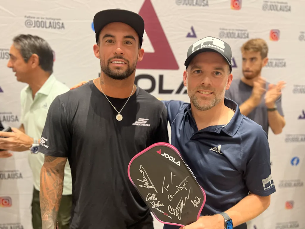 Das Tyson McGuffin Magnus 3S Paddle konnte ich zwar in der Hand halten, aber spielen nicht. Wer spielt schon mit einem frisch von Ben Johns, Collin Johns, Anna Bright, Dekel Bar, Federico Staksrud und natürlich Tyson McGuffin himself unterschriebenen Paddle? Das Paddle gehört selbstverständlich in die Vitrine (wenn ich doch eine hätte).