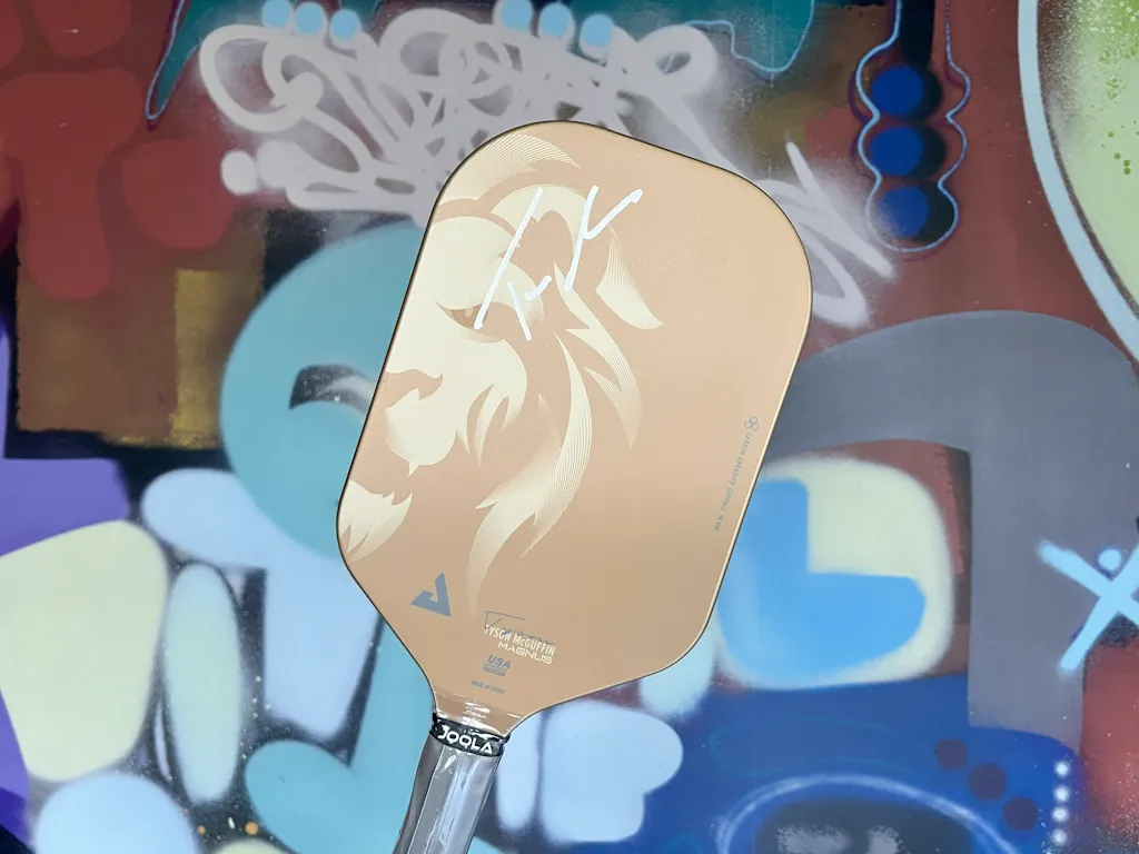 Das Tyson McGuffin Magnus Lion CAS 14 Paddle überzeugt durch seine Optik, es ist das erste Edgeless Pickleball Paddle von Joola! Die Verarbeitung ist wunderschön, das Gold und der Löwe stechen heraus und lassen dich auf dem Court sehr gut und stark aussehen. Das Paddle ist ein geniales Glasfaser Paddle, welches bestimmt zu dir passt. Tyson McGuffin hat es für mich signiert 🙂 .